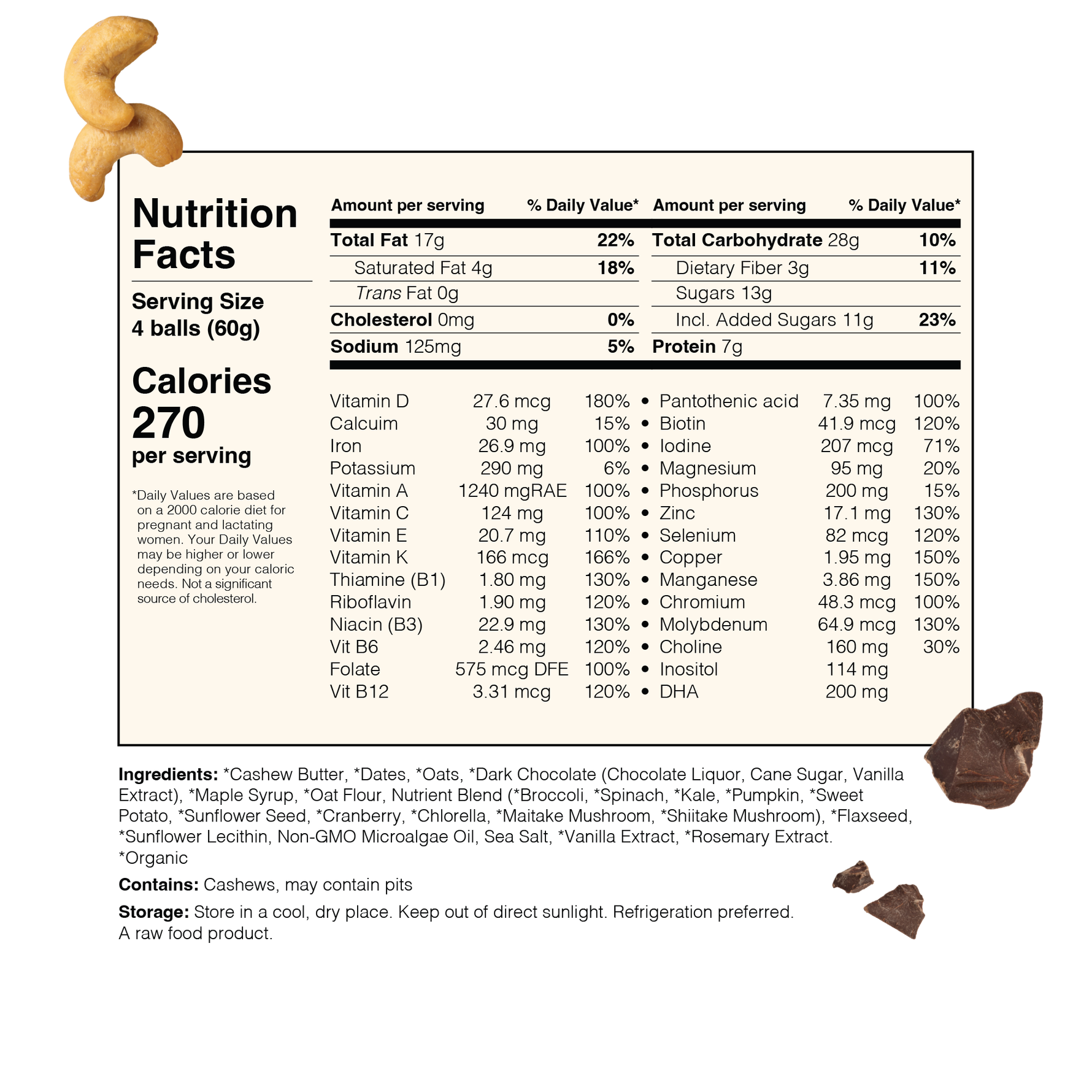 Ingredients: *Cashew Butter, *Dates, *Oats, *Dark Chocolate (Chocolate Liquor, Cane Sugar, Vanilla Extract), *Maple Syrup, *Oat Flour, Nunona Nutrient Blend (*Broccoli, *Spinach, *Kale, *Pumpkin, *Sweet Potato, *Sunflower Seed, *Cranberry, *Chlorella, *Maitake Mushroom, *Shiitake Mushroom), *Flaxseed, *Sunflower Lecithin, Non-GMO Microalgae Oil, Sea Salt, *Vanilla Extract, *Rosemary Extract.