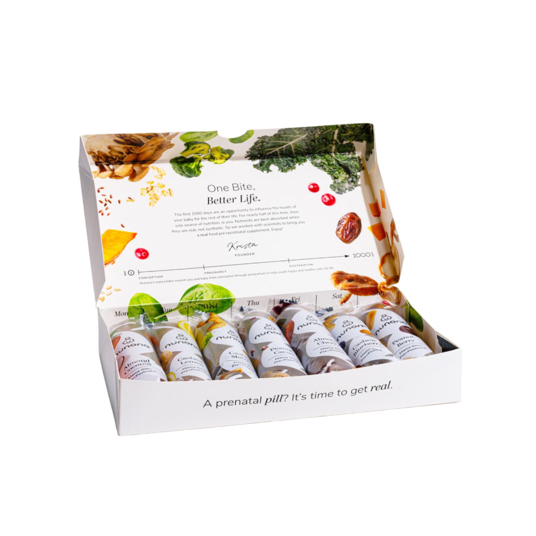 Each bite flavor has the essential nutrients for mom and baby. Nunona has 27 micronutrients and 10% daily macronutrients, all from organic, whole foods.